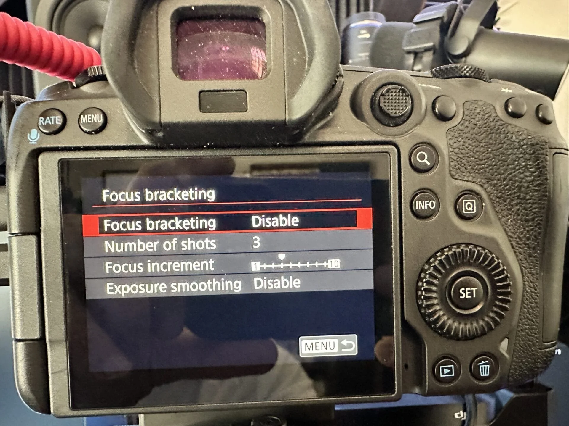 The Canon R5 makes bracketing straightforward with its robust feature set. To access this, go to the red "Shoot" menu #5, where you'll find "Focus Bracketing." Here’s a quick guide: