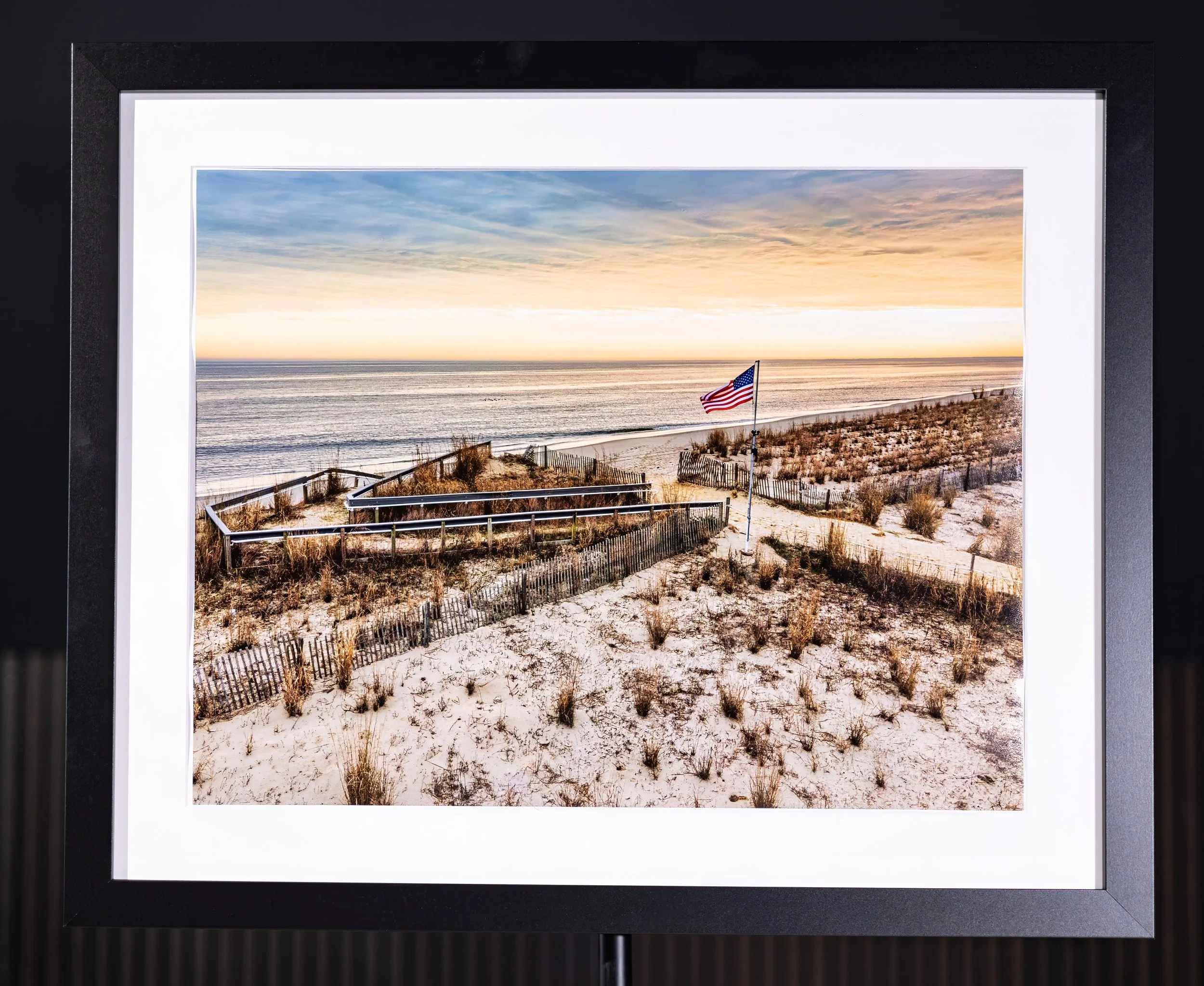 Awaken to the serene beauty of Broadkill Beach, Delaware with this stunning framed photograph, capturing a peaceful sunrise over the beaches sandy entrance. In the heart of this tranquil scene flies an American flag, proud and vibrant, symbolizing a spirit of freedom and resilience. The soft morning hues paint the sky and ocean in a breathtaking palette, inviting viewers to pause and reflect on the quiet majesty of dawn at the seaside.
